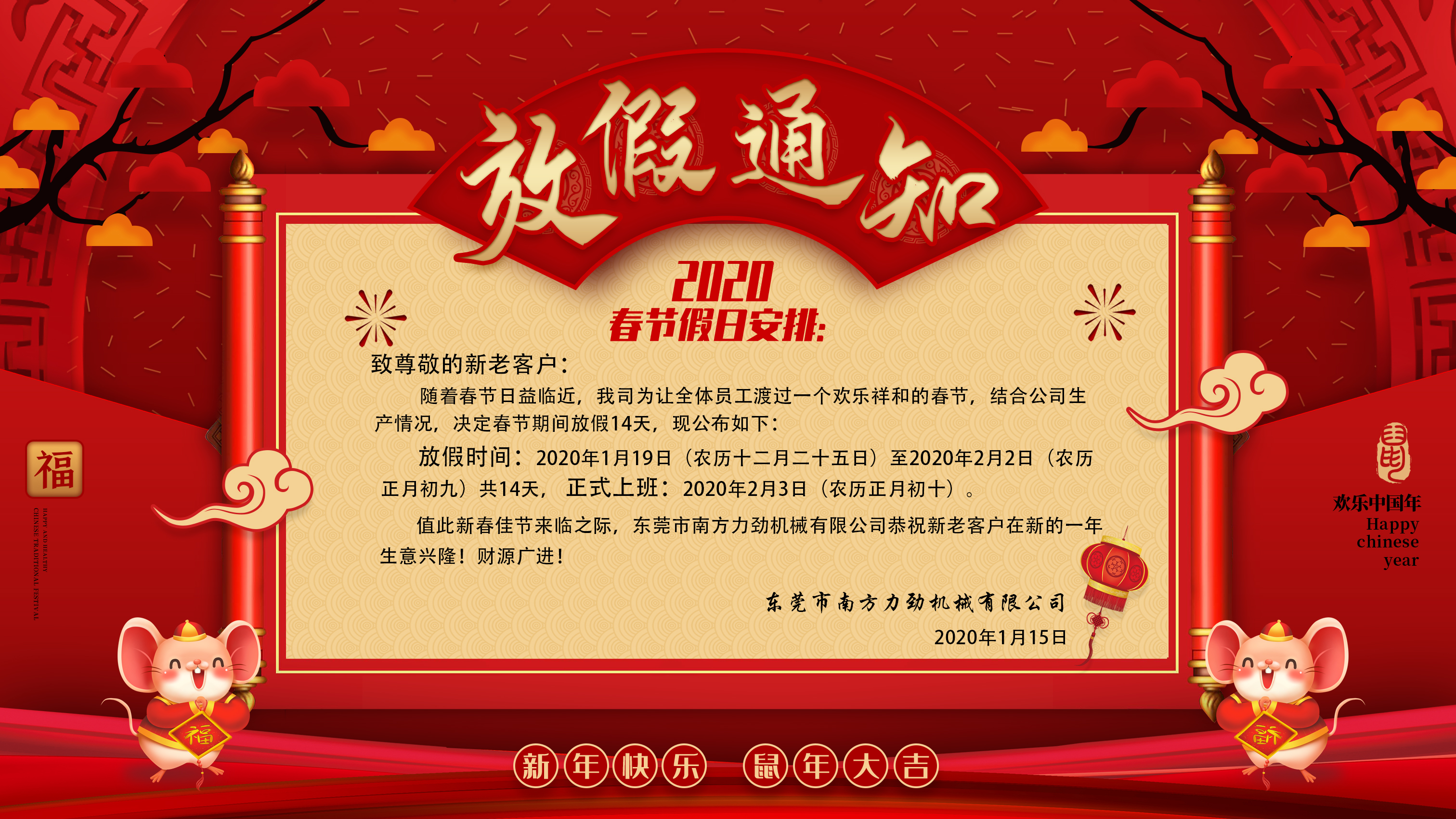 東莞市南方力勁機械有限公司春節(jié)放假通知
