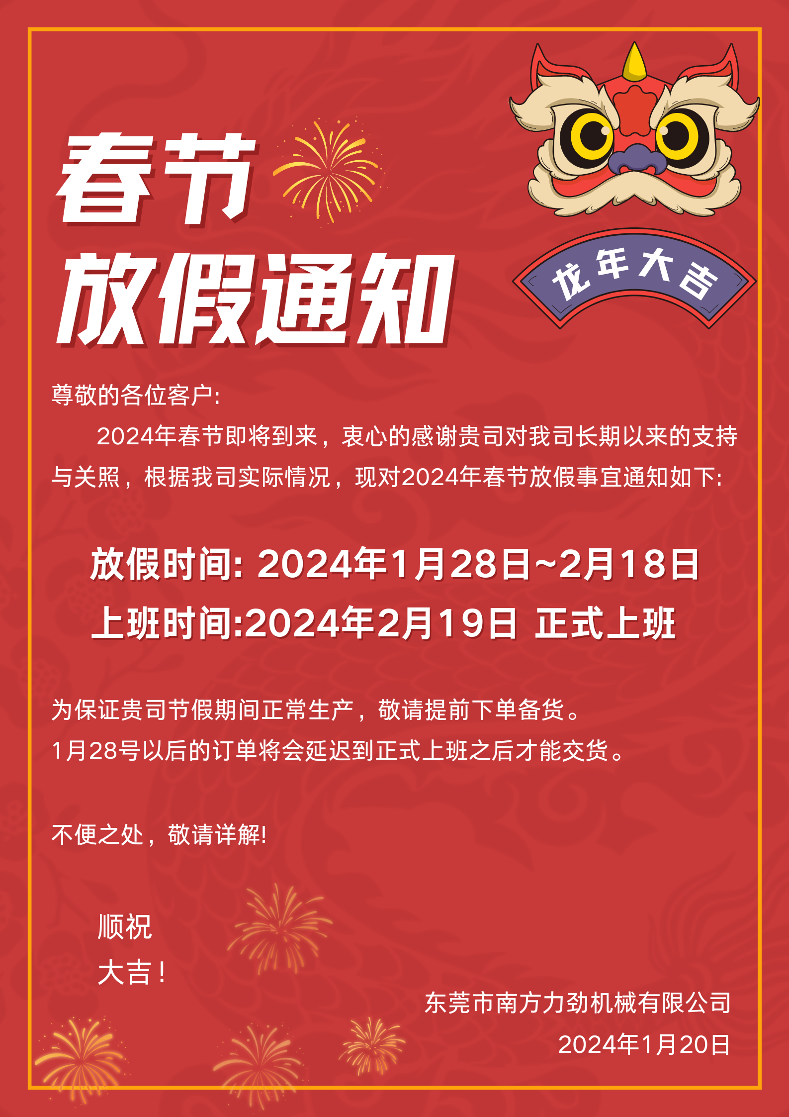 為了讓員工更好地享受春節(jié)的歡樂(lè)時(shí)光,東莞市南方力勁機(jī)械有限公司將放假時(shí)間定于2024年1月28日(臘月十八)至2月18日(正月初九)。期間公司將暫停生產(chǎn)和辦公,只接單不發(fā)貨,2月19日(正月初十)正式上班。請(qǐng)各位客戶(hù)提前做好備貨計(jì)劃,以免因假期影響您的正常需求。