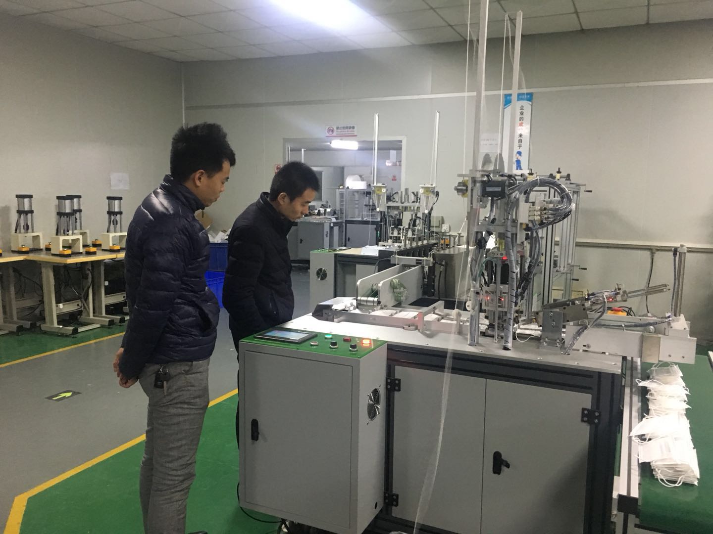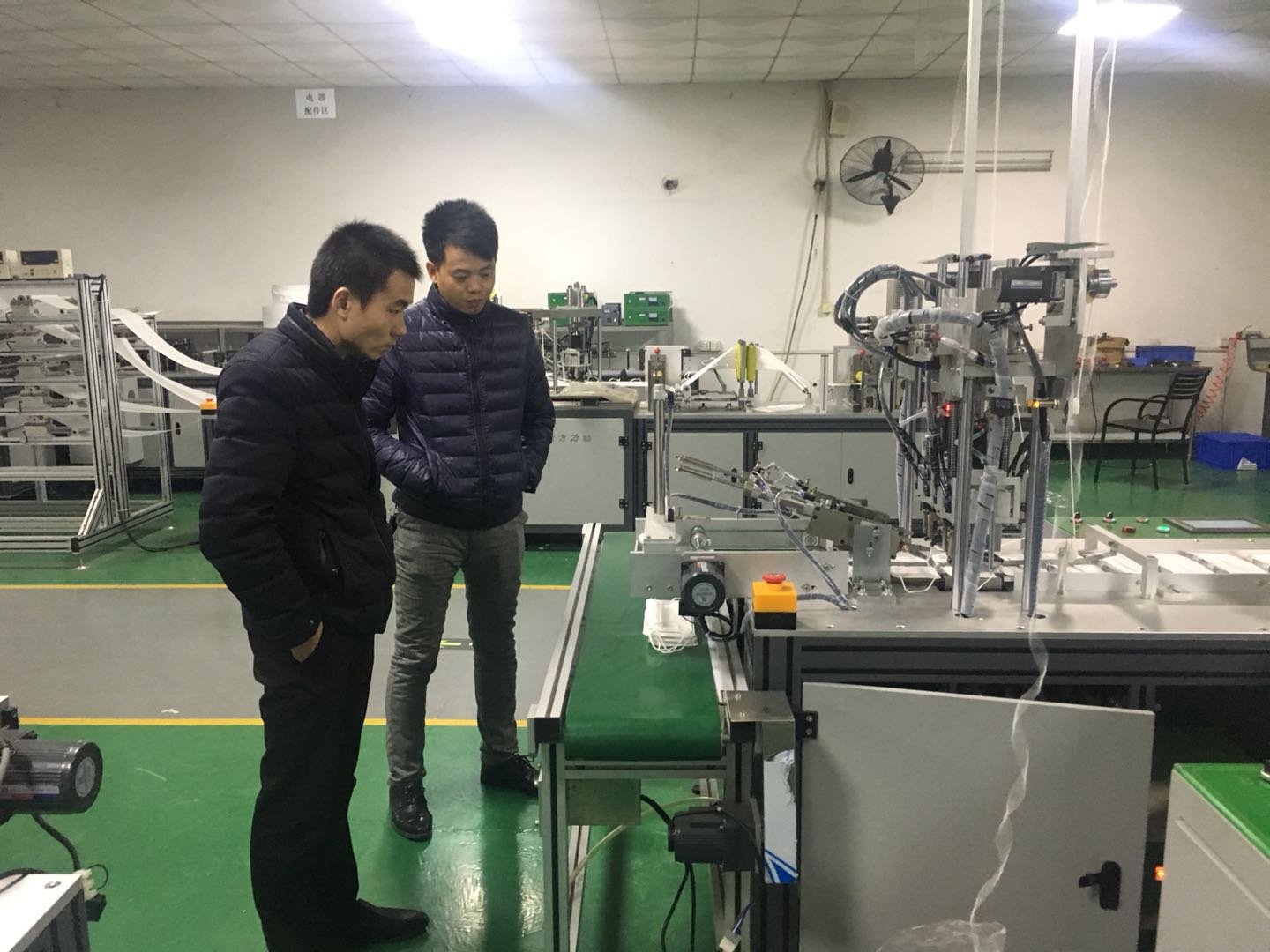2018131日星期三,江蘇康吉醫療科技有限公司朱總來我公司洽談全自動平面一拖二(外耳型)口罩產線,朱總這次來南方考察口罩機設備,已走訪了4家,今天再次來到南方力勁,敲定一套全自動平面一拖二口罩產線;