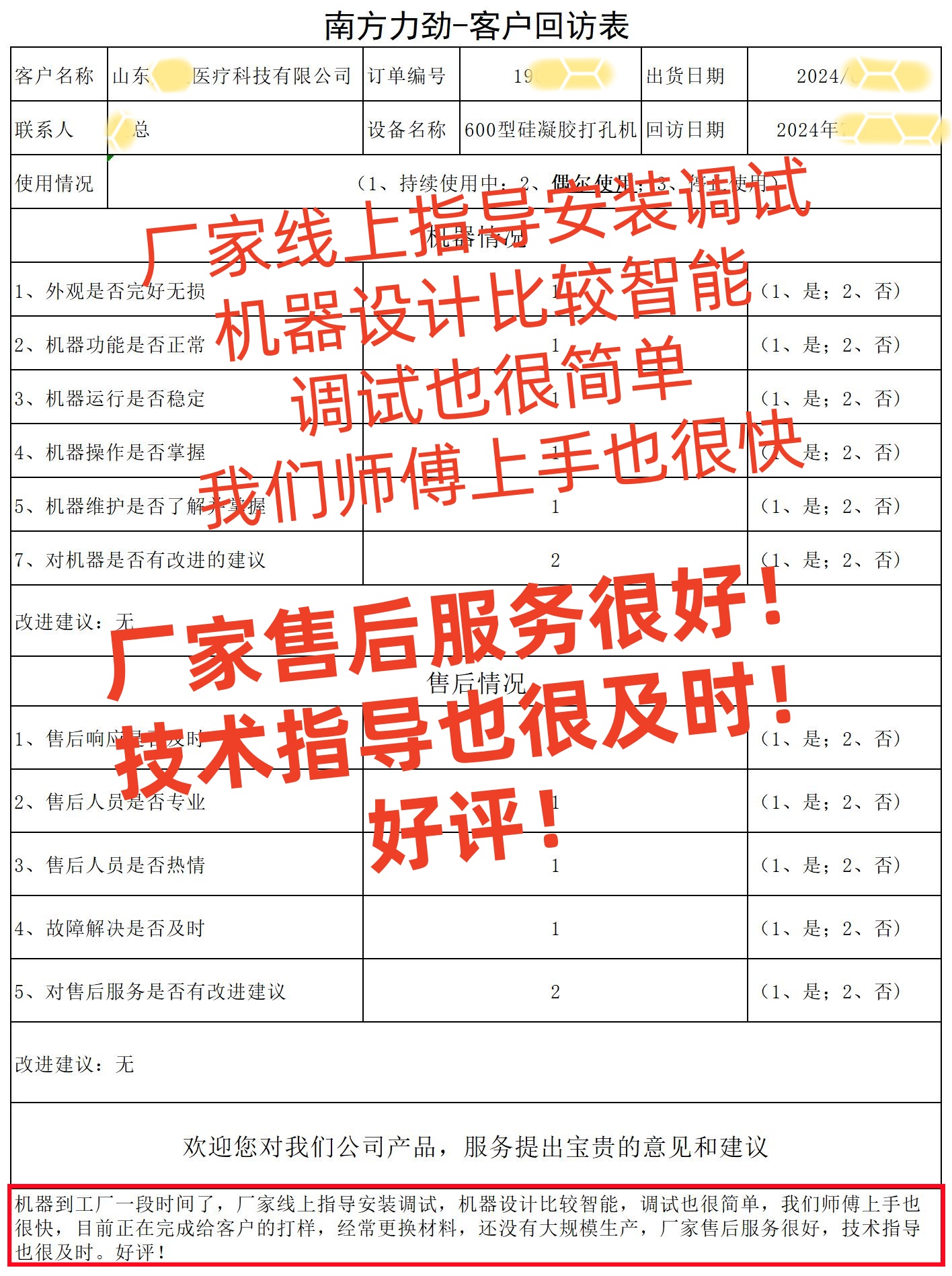 近日,我們收到了來(lái)自山東醫(yī)療器械行業(yè)客戶的高度評(píng)價(jià),讓我們一同來(lái)感受他們與硅凝膠打孔機(jī)的精彩故事。