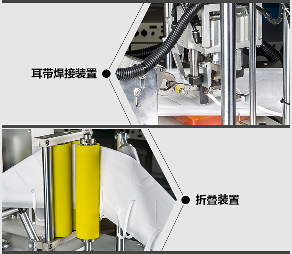 3.生產效率高,折疊成型,耳帶焊接結實美觀,拉力強勁,自動上鼻梁條和自動印刷功能。