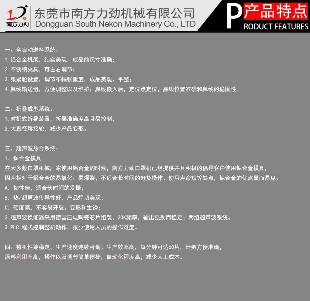東莞市南方力勁機械有限公司是一家大型超聲波設備生產企業,主營全自動口罩機,平面口罩機,折疊口罩機,杯型口罩機,柳葉型口罩機,超聲波裥棉機,汽車腳墊壓花機,超聲波剪切機,超聲波分條機,超聲波花邊機,超聲波縫合機,超聲波釘珠機,皮革沖孔機,條形帽機,鞋套機等設備,同時可為客戶提供非標定制的自動化設備,是國家高新技術企業。聯系電話:400-600-8299