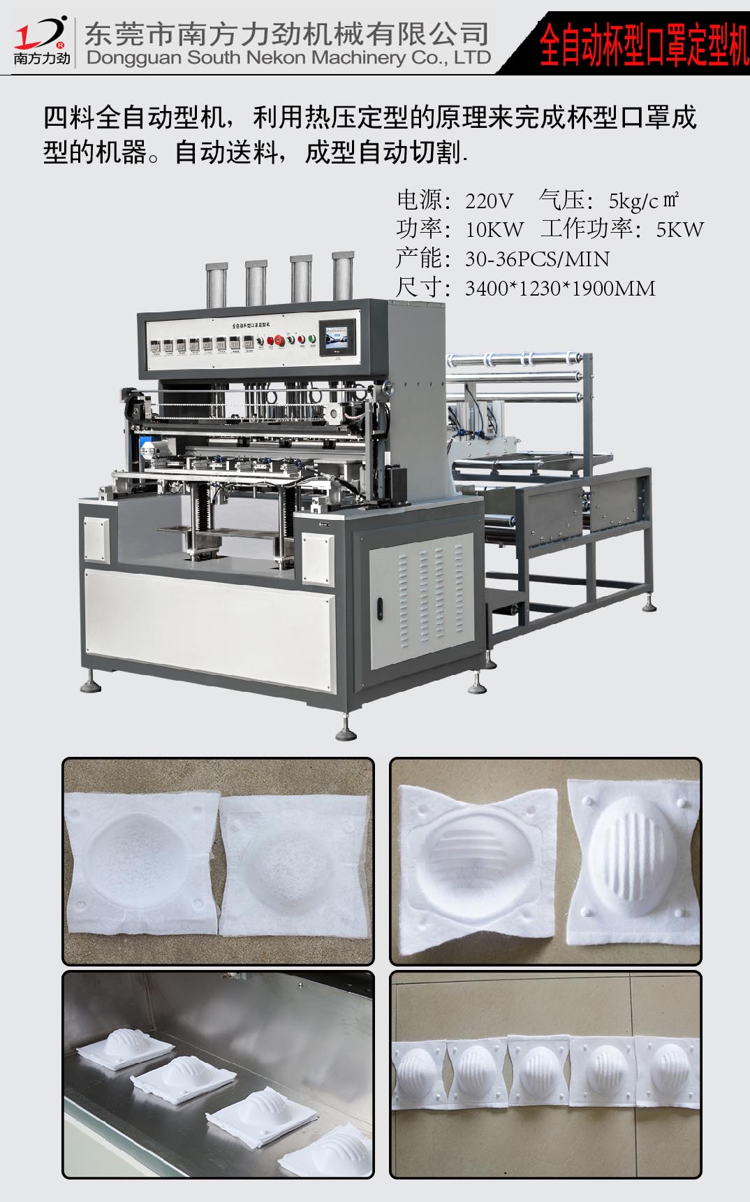 南方力勁全自動杯型口罩成型機利用高溫熱壓成型原理使工件結實成型。該口罩成型機可以自動完成從送料,到同時成型、剪切以及退料等多道工序,相比傳統的人工送料、退料、剪切可以省去3-5個人工,每分鐘可生產口罩30-36個,采用PLC控制系統,觸摸屏設置,操作簡單快捷,可單人單機使用,人工放料及取料。增添生產效率。