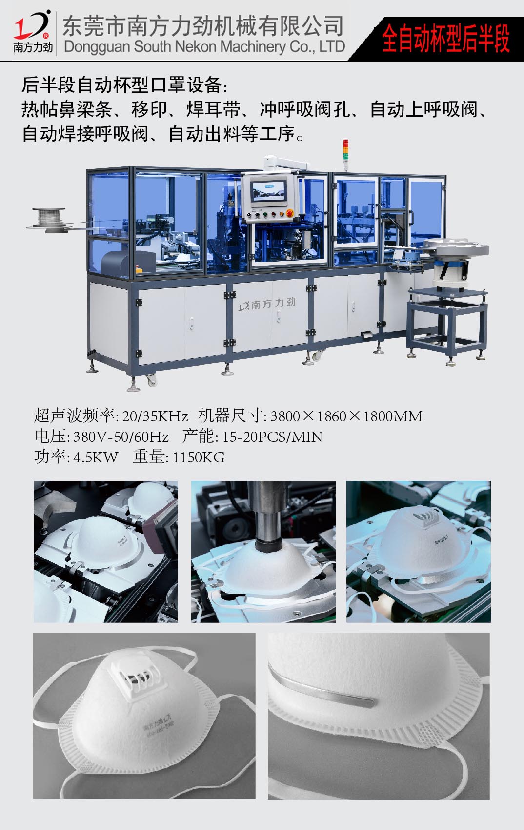 分段全自動杯形口罩機由1臺全自動4料定型機,1臺杯型口罩轉盤熔接切片機,1臺杯型口罩后段全自動機組成。該套設備有用人較少,自動化程度較高,生產穩定的特點,每分鐘產能12個。